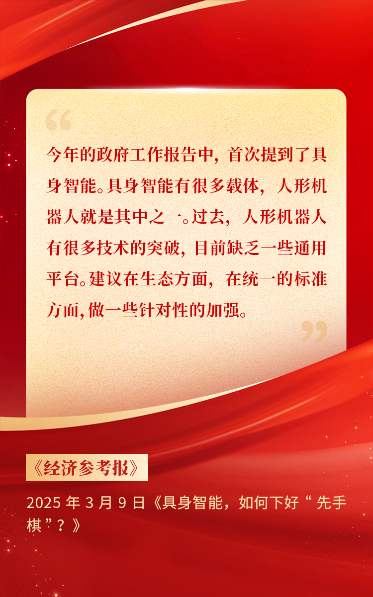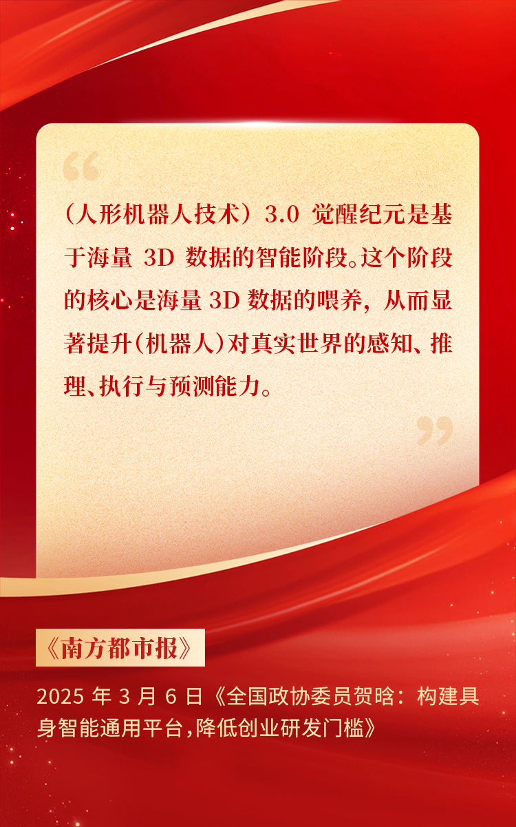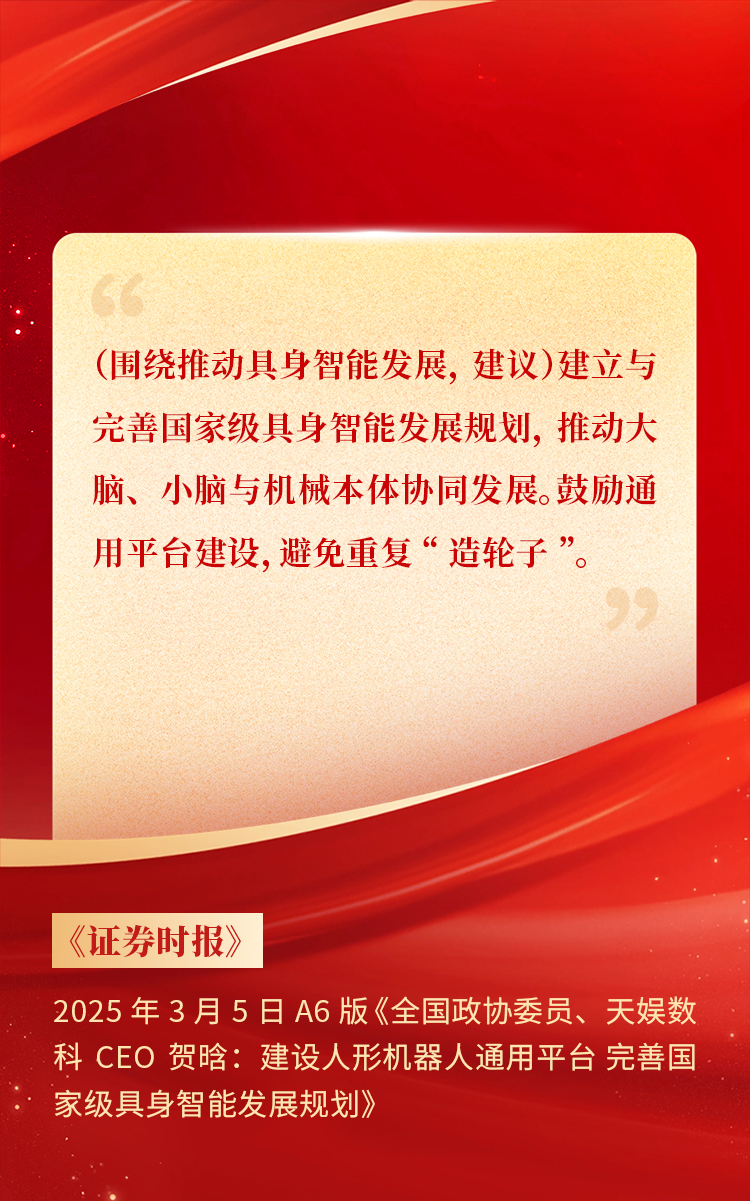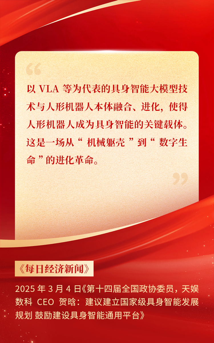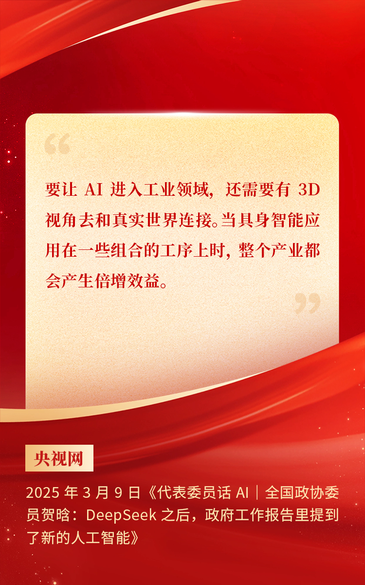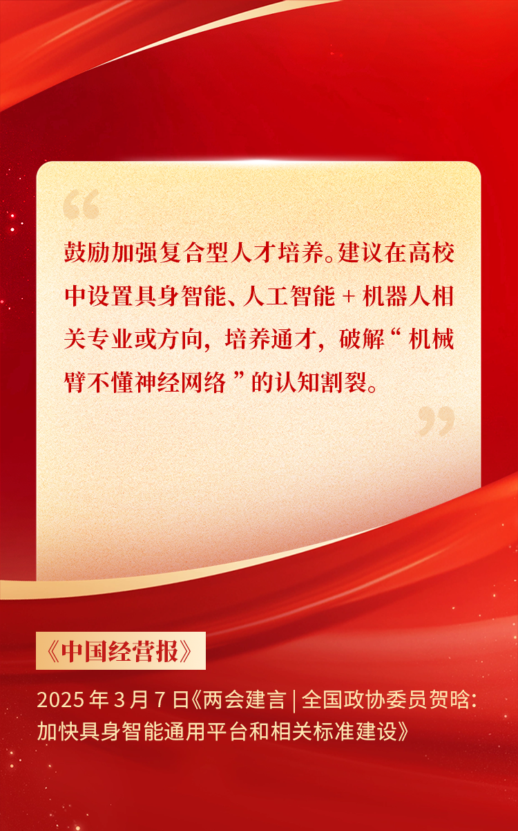 2025年3月10日下午,,,全国政协十四届三次会议于北京顺利闭幕。。。在今年的政府工作报告中,,,“科技”“技术”“创新”等词汇成了高频词,,,并且首次出现“具身智能”“6G”“智能机器人”等新词,,,强调“因地制宜发展新质生产力”。。。全国政协委员 、、、胜天国际CEO贺晗连续第三年上会履职,,,围绕“具身智能”“人形机器人”“人工智能产业”等热词积极建言,,,受到了媒体的广泛关注,,,吸引了来自央视网 、、、经济参考报 、、、中国电子报 、、、第一财经日报等央党媒体 、、、主流财经等媒体记者的专访报道,,,让我们一起回顾贺晗委员两会建言!